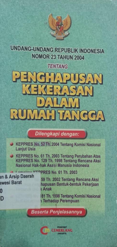 | Judul | UNDANG-UNDANG REPUBLIK INDONESIA NOMOR 23 TAHUN 2004 TENTANG PENGHAPUSAN KEKERASAN DALAM RUMAH TANGGA : BESERTA PENJELASANNYA / CEMERLANG |
